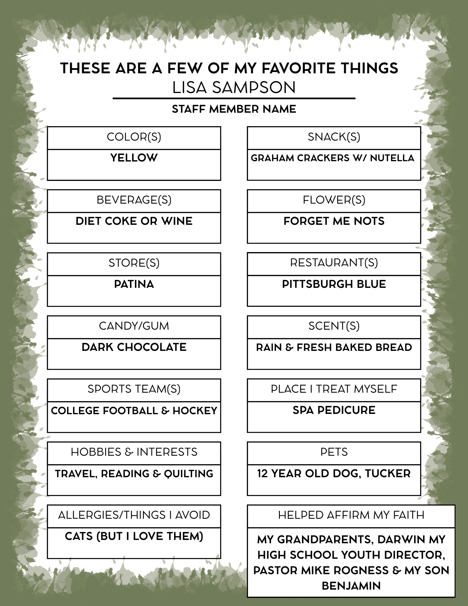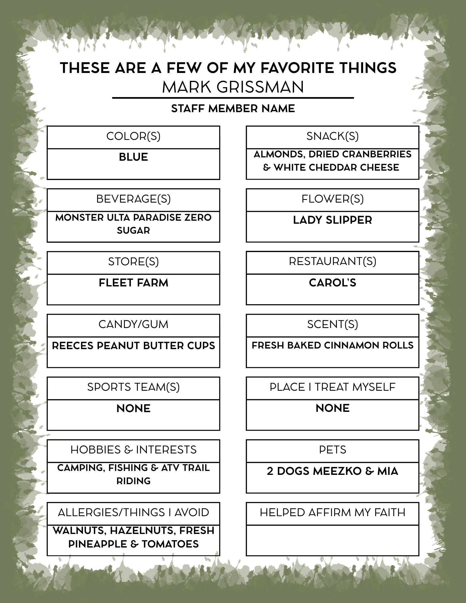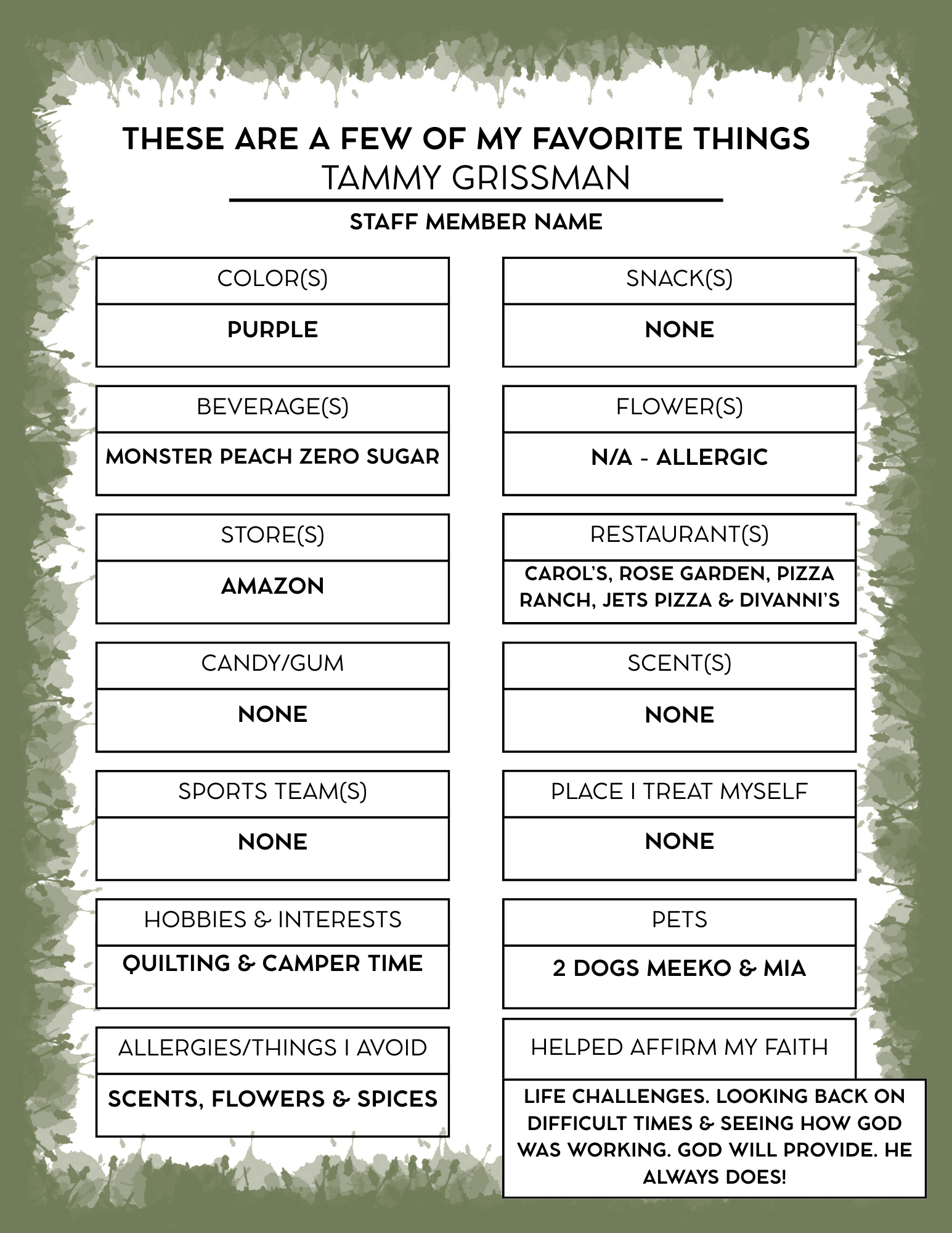 Tammy and her husband, Mark—who serves as the facility manager—enjoy spending time together with their children and grandchildren. They also love relaxing at their camper, quilting, and making memories together. At home, they are kept company by their two dogs, Meeko and Mia.