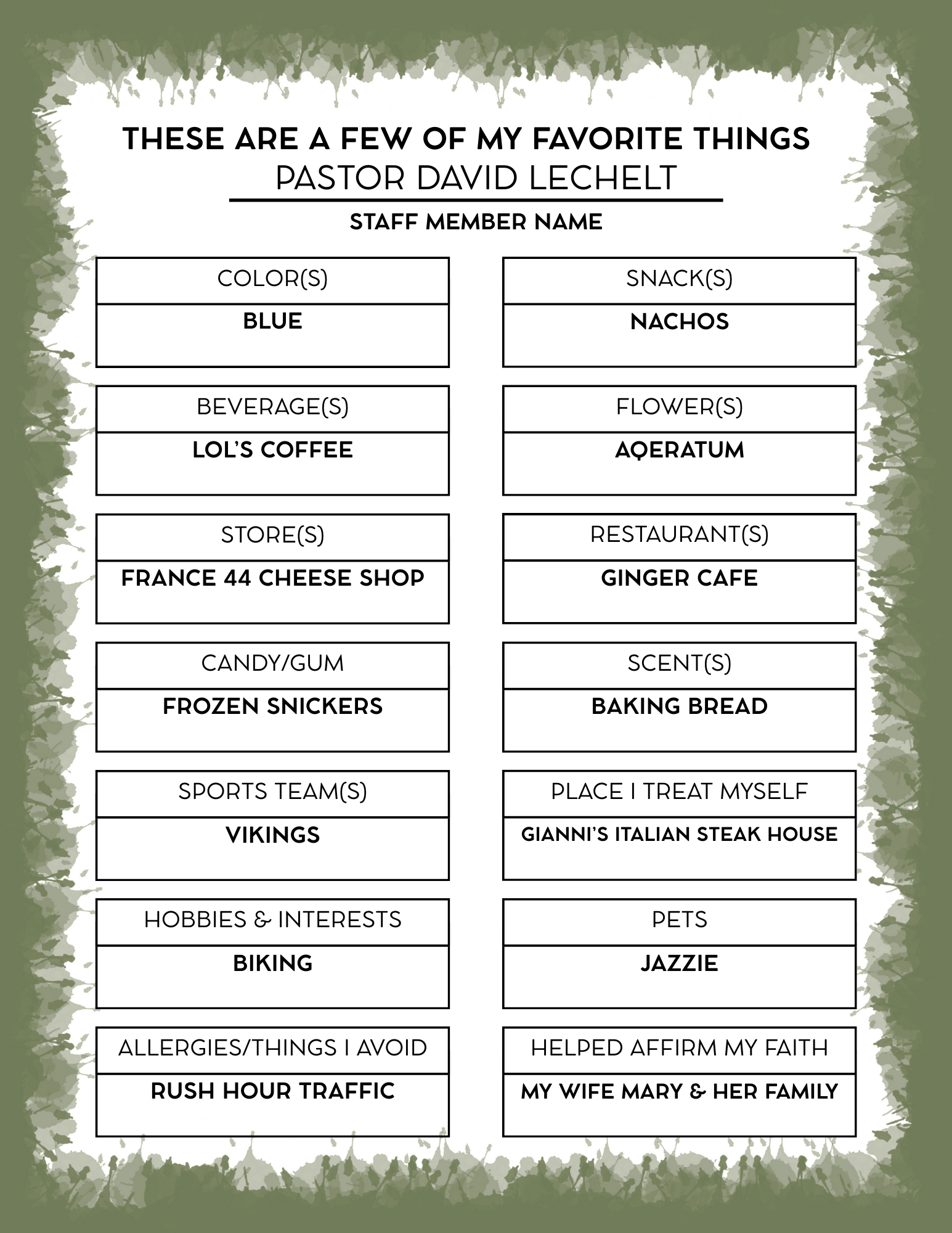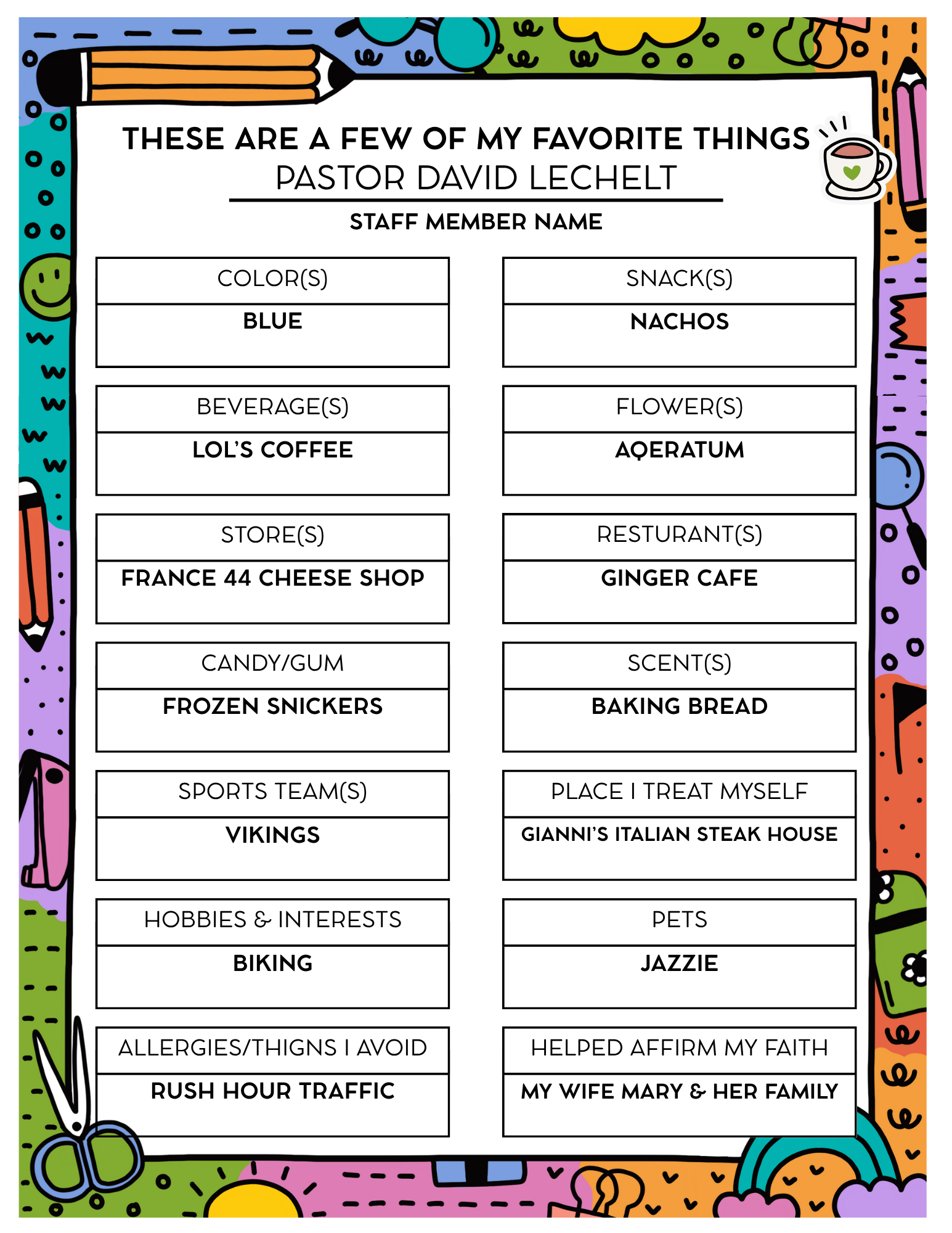 Without a doubt he would encourage you to experience Sunday as “The Best Day of the Week.” From bible-based extemporaneous sermons to inviting our kids to show off their colorful socks with him, you won’t miss his warm welcome, love of people, and joyful invitation to life together in Jesus Christ.